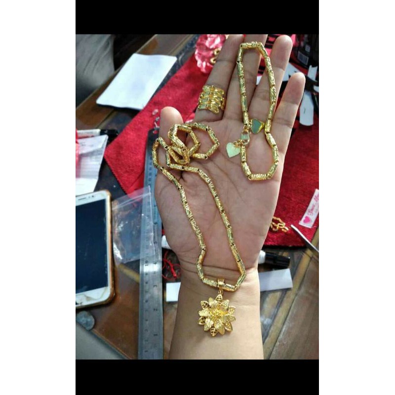 READY STOK yaa sisst- Kalung bambu 45cm- Liontin- Gelang- CincinSecara fisik 98% mirip dengan emas 24k asli.Di kaitan nya ad tulisan 24k yaa..Warna kuning tidak kemerahan persis emas 24k, hampir tidak ada bedanya dengan emas 24k aslinya, bisa membuat penampilan anda lebih menarik.Sangat cocok dipakai pada acara pesta, acara pernikahan, untuk pengantin maupun acara spesial lainnya.Daya kilau emas nya bisa tahan 1 tahun lebih tergantung pemakaian, bila sudah kusam bisa di sepuh/cuci ulang lagi!Aman dipakai dan anti alergi.Info dan untuk ukuran chat kita atau ketik di pesan ukuran cincin nya..Foto terakhir cara mengukur cincin.Happy shopingNB; foto jepretan sendiri tanpa editan yaa#emaskuning #emassepuhan #replikaberlian #replikaemas #emas24karat #emas24k #emasmurni #emasmurahonline #emasmurah #emas18k #emasimitasi #aksesorisemas24k #emas24kpalsu #lapisemas24k #emassumatera #emaskw #kalungemas24k #gelangemas24k #kalung #gelang #c