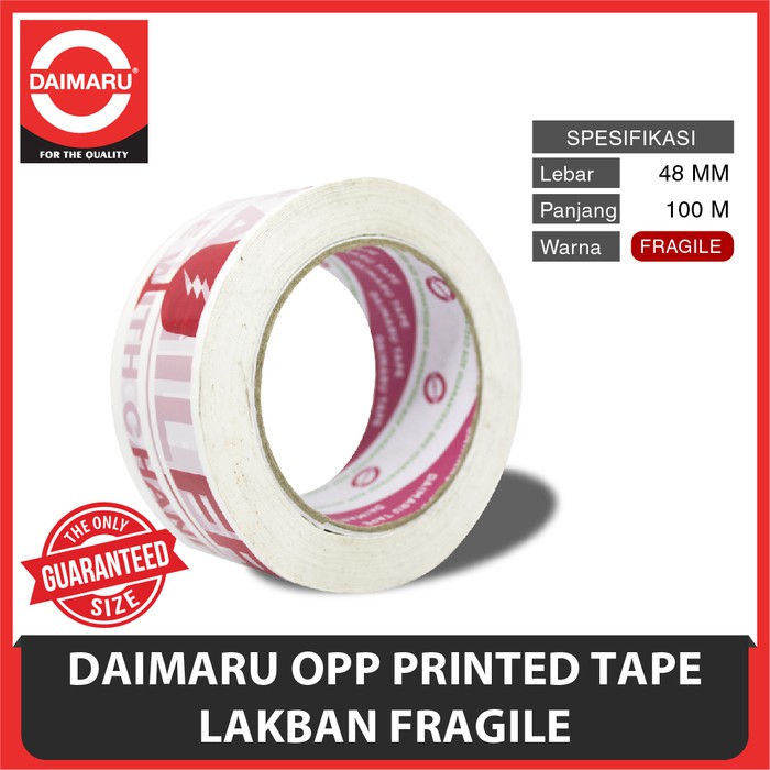 DAIMARU TAPE - LAKBAN - FRAGILE - MERAH/PUTIH - 2 INCHI 100 METEROPP PRINTINGOPP Printing mempunyai speksifikasi yang sama dengan OPP Tape Daimaru. Terbuat dari Biaxialy berorientasi polypropylene film berorientasi pada tingkat kekuatan dan fleksibilitas bersama dengan berbasis air lem akrilik yang kuat (Strong Water Based Acrylic Adhesive). Struktur molekul khusus dan stabilisasi resin polypropylene berorientasi Biaxialy filmnya menawarkan sifat mekanik dan optik yang sangat baik dan berguna dalam banyak aplikasi.PemakaianDigunakan untuk segel dus pada momen-momen tertentu, penanda karton, label sayuran, dan lain sebagainya.Lakban DAIMARU ini sangat cocok digunakan untuk pengepakan barang & bisnis online andalakban ini sangat berkualitas karena tdk mudah sobek dan perekatnya sangat kuat.48 mm x 100 m47 MicronLebar = 2" ( 48 mm )Panjang = 100 meter#lakban #lakbandaimarumurah #daimarutape #daimaru #lakbanmurah #isolasi