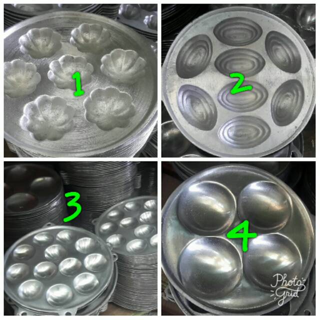 Cetakan kue cubit terbuat dari bahan alumunium cor..Detail tiap nomor:No. 1 = Cetakan kue cubit motif bunga 7 lubangNo. 2 = Cetakan kue cubit motif oval list 8 lubangNo. 3 = Cetakan kue cubit 12 lubangNo. 4 = Cetakan kue cubit 4 lubang Silahkan order di variasi, jika variasi bisa di klik itu menandakan barang ready