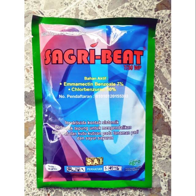 Sagri-beat adalah insektisida kontak sistemik untuk mengendalikan telur, ulat dan kutu-kutuan pada tanaman padi dan sayur-sayuranBerat bersih : 80 gramBahan aktif : Ammamectin Benzoate 7%, Chlorbenzuron 30%Petunjuk penggunaan :Bawang merah ( ulat grayak, telur ulat, Aphids, Thrips, Liriomyza, Mites ) Gunakan 0,25 - 0,5 gram/liter airPenyemprotan dapat dilakukan saat serangan hama mulai nampak dan diulang dengan interval 3 - 5