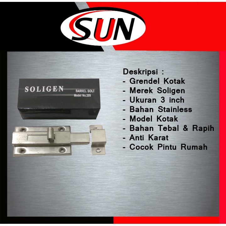 Deskripsi :- Slot / Grendel Pintu- Ukuran 3 " Inch- Bahan Plat stainless- Model kotak- Bahan tebal dan rapih- Isi 1 set Slot + Sekrup- Cocok Pintu kamar Mandi / kamar Tidur==========================================================Grendel Soligen memilki kualitas barang yang sangat baik dilihat dari material memilki plat yang lebih tebal dibandingkan dengan yang lain serta didukung finishing yang baik. Soligen sendiri sudah memiliki nama didalam produk home hradware yang berkualitas dengan harga yang terjangkau.Salam,Sun Har