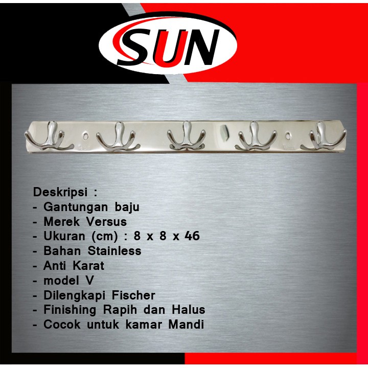 Deksripsi :- Gantungan Baju- Model Versus- 5 kait- Ukuran (cm) 46 x 3,5- Bahan Stainless- Model V- Model Elegan dan mewah- Finishing Rapih ---------------------------------------------------------------------------------------------------Gantungan baju Versus memilki model V pada pengaitnya yang dapat mengantungkan 2 pakaian dan memilki bahan dari stainless dan Chrome. serta dilengkapi 5 kait Cocok untuk kamar mandi maupun kamar tidur anda.Salam,Sun Har
