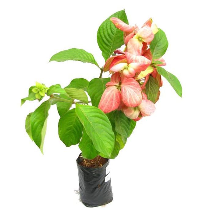 Mussaenda Pink tanaman hias yang tergolong pohon berbunga, tumbuh tanpa mengenal musim, bunganya berwarna pink cantik.Bibit tanaman berasal dari: Cangkok Nama ilmiah (Botanical name): Mussaenda SP Tinggi tanaman saat ini: 20-40 cm Rekomendasi iklim yang ideal: Dataran rendah dengan cuaca panas Media tanam disarankan: Tanah biasa atau tanah humus (2 : 1) Diameter pot disarankan: 20-30 cm Kebutuhan sinar matahari: Sepanjang hari Kebutuhan air & penyiraman: Sedang, siram 1x dalam s