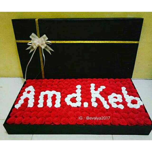 * bahan dasar bunga, kain flanel* Ukuran P 70cm x L35cm x T8cm* bisa request warna sesuai keinginan max 3 warna* pengerjaan 3-6 hari (konfirmasi)* Free Gift Card (by request & selama stok msh tersedia)* custom tulisan sesuai pesanan* silahkan isi data berikut pada kolom deskripsi pemesananWarna bunga :Tulisan :Warna bunga tulisan :Tulisan Pada Tutup :=====================≠=≠===================Bunga yang kami buat bukan hanya sekedar LILITAN KAIN tetapi memang menggunakan pola dan dibetuk hampir menyerupai bentuk asli bunga maw