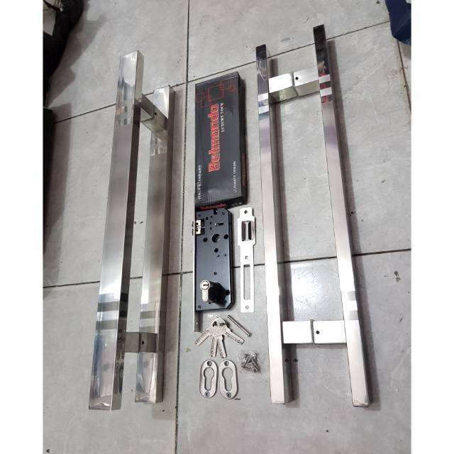 paket handle pintu stainless minimalis baut tembus ANTI KARAT-panjang 60cm-lebar handle 4cm-tebal handle 2cmpaket untuk pintu kupu2 (pintu 2)2set (4gagang) + body pelor belmondo isi 4 anak kunci kompu